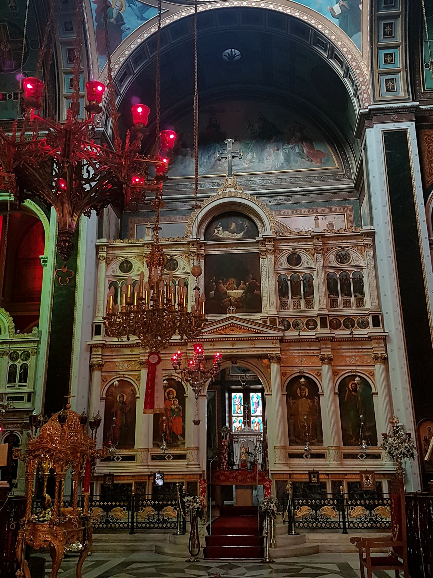 Είναι από πεντελικό μάρμαρο, με ένθετα μάρμαρα Ιταλίας στα πλαίσια και τη βάση. Καλύπτεται από ανάγλυφα και εγχάρακτα κοσμήματα τονισμένα με χρυσό. Εντυπωσιακοί είναι οι ανάγλυφοι καθιστοί άγγελοι της Ωραίας Πύλης. Ο μαρμάρινος άμβωνας (δωρεά Δ. Βαφιαδάκη το 1868) σχεδιάστηκε από τον Αντ. Φραγκούλη με βάση τον άμβωνα της Μητρόπολης Αθηνών. Ο μαρμάρινος επισκοπικός θρόνος ήταν δωρεά της οικογένειας Πρωίου.
