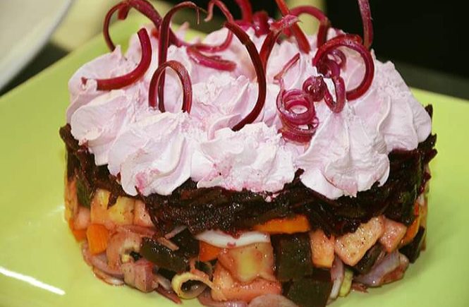 - Για τη βινεγκρέτ χτυπάμε ελαφρώς 50 γραμ. κρέμα γάλακτος, 50 γραμ. χυμό παντζαριού, ξύδι, αλάτι και πιπέρι.