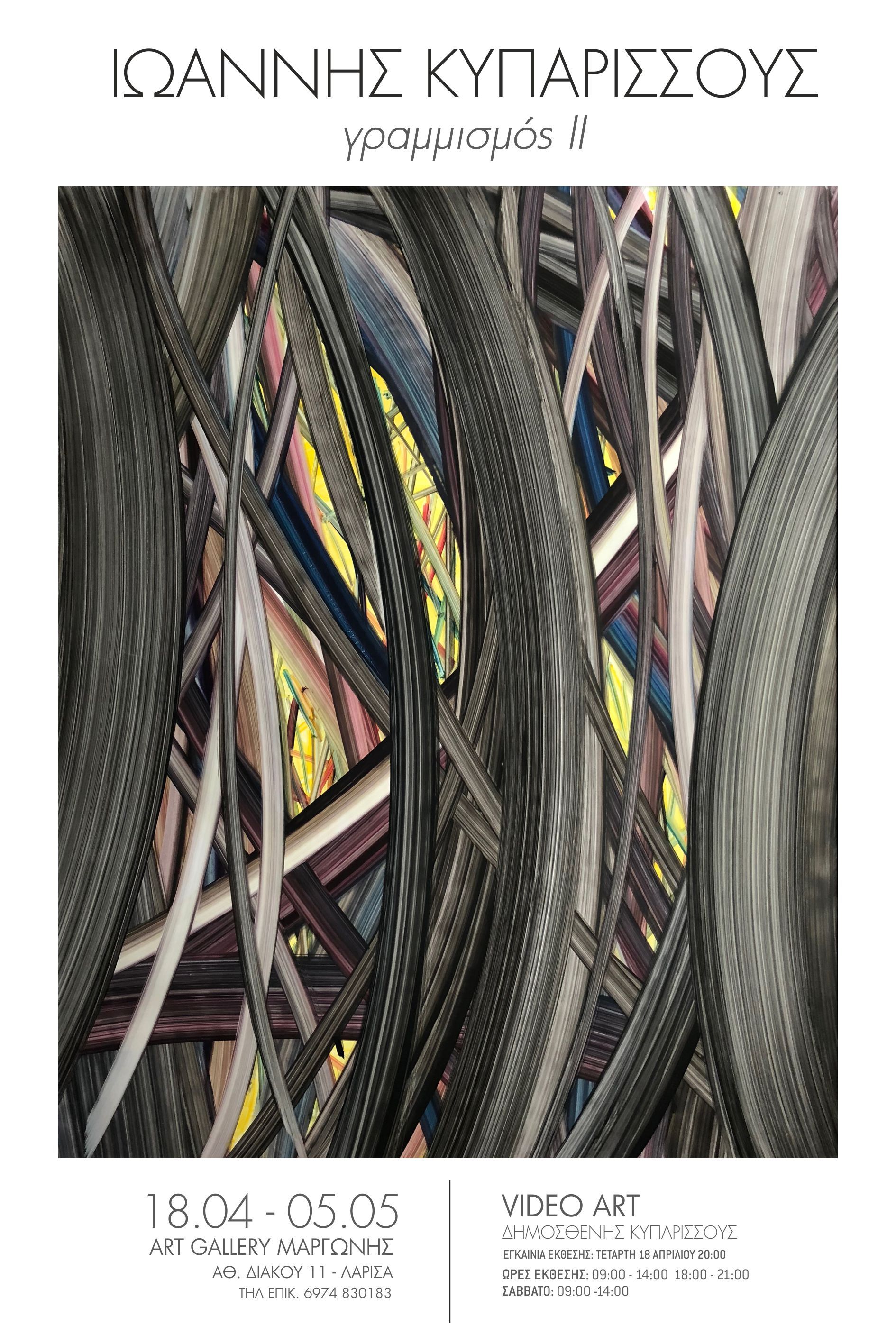 Στις 18 Απριλίου θα πραγματοποιηθούν τα εγκαίνια της έκθεσης ΓΡΑΜΜΙΣΜΟΣ II του Ιωάννη Κυπαρισσούς, ο οποίος κλείνει το μάτι στην εμμονή της ιστορίας με τα ρεύματα και τις κατατάξεις. Η έκθεση θα φιλοξενηθεί στο χώρο ART GALLERY ΜΑΡΓΩΝΗΣ, Αθ. Διάκου 11, Λάρισα. Ο Γιάννης Κυπαρισσούς δουλεύει καλλιτεχνικά καθημερινά, δημιουργώντας έργα που ταυτόχρονα θα σημαίνουν τη φυγή, αλλά και τη σούμα της εβδομάδας. Η ζωγραφική για τον ίδιο δεν είναι τέχνη φωνακλάδικη, είναι περισσότερο μια διακριτική συντροφιά, η οποία ωστόσο έχει έναν καταλυτικό ρόλο στη ζωή, την κάνει βιώσιμη.