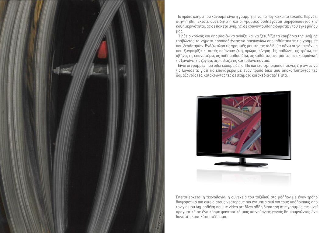Έπειτα έρχεται η τεχνολογία, η συνέχεια του ταξιδιού στο μέλλον με έναν τρόπο διαφορετικό, πιο οικείο στους νεότερους, πιο εντυπωσιακό για τους υπόλοιπους από τον γιο μου Δημοσθένη που με video art δίνει άλλη διάσταση στις γραμμές, τις κινεί πραγματικά σε ένα κόσμο φανταστικό μιας καινούργιας γενιάς δημιουργώντας ένα δυνατό εικαστικό αποτέλεσμα.